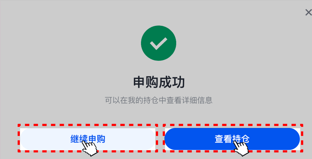 4、在申购成功后可立即前往持仓页面查看订单信息,也可关闭弹窗继续申购产品;