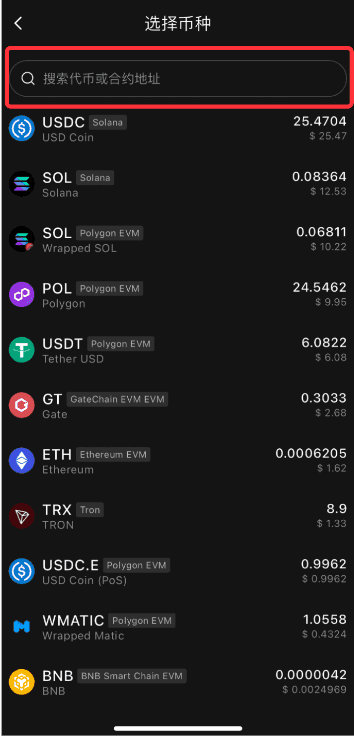 看准您要进行充值或转账的代币。您可以通过下拉代币界面选择代币,也可在搜索栏中直接搜索代币名称。