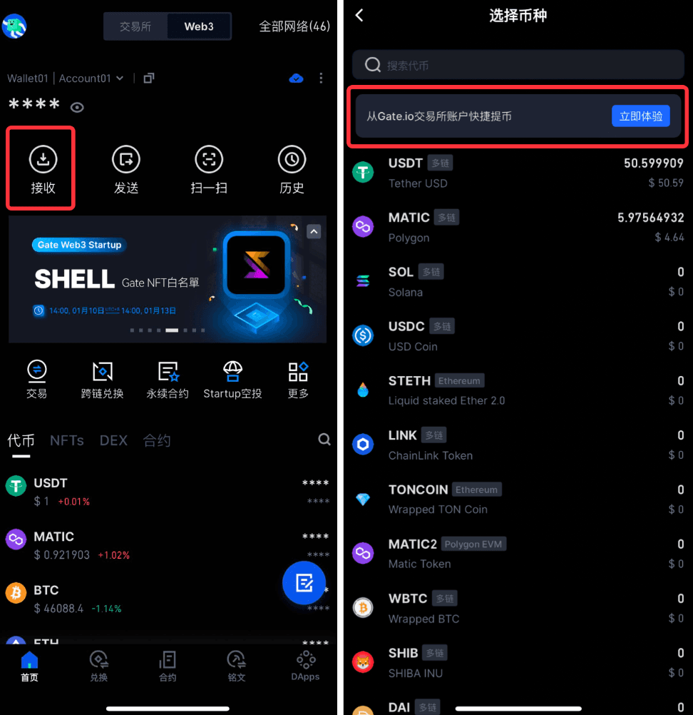 点击 Web3 钱包首页【接收】,在选择币种页点击页面上方【立即体验】。