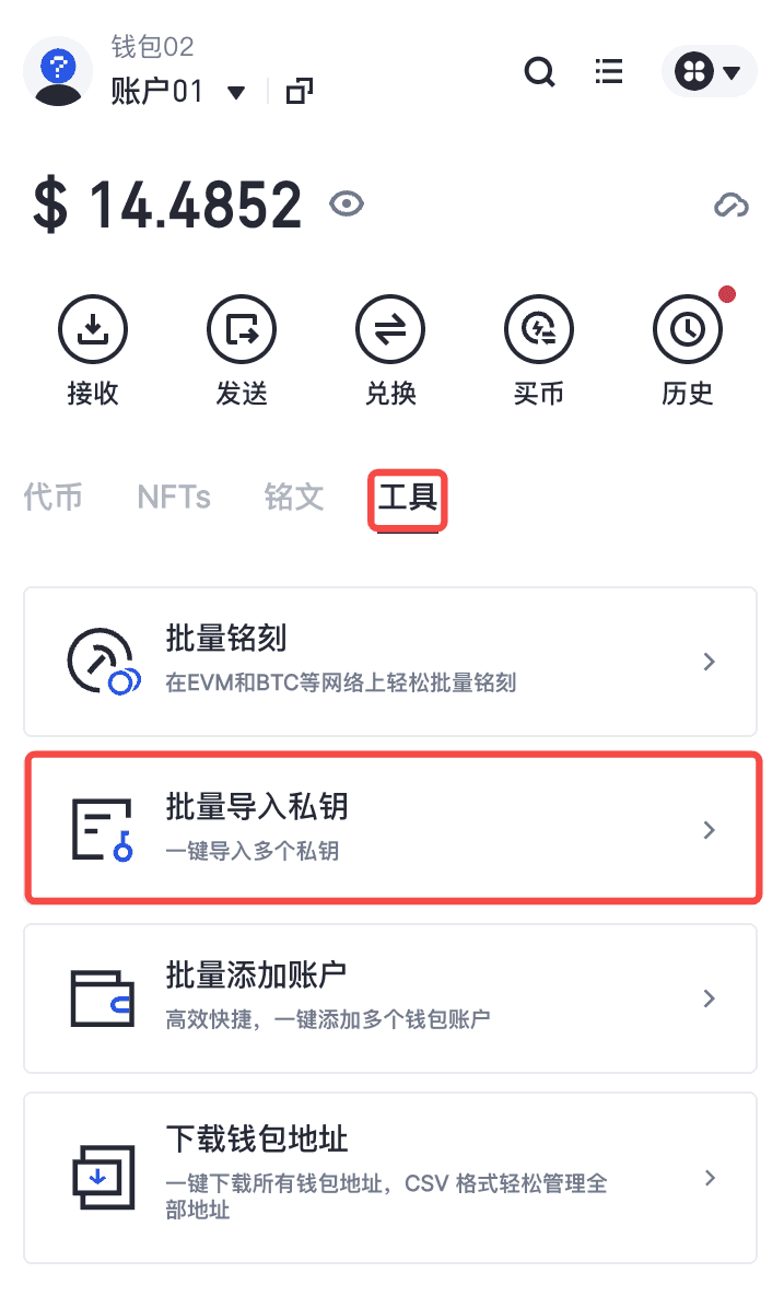1.在插件钱包页面点击「工具」一栏,选择「批量导入私钥」;