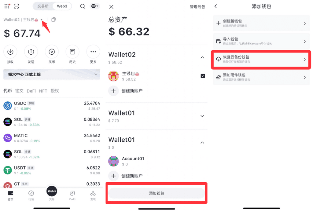 如下所示操作:点击首页左上角账户倒三角按钮,点击【添加钱包】-【恢复云备份钱包】,输入资金密码,即可恢复云备份钱包。