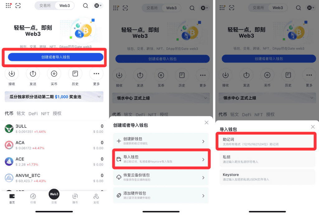 点击【创建或导入钱包】按钮,选择【导入钱包】- 输入助记词,即可恢复钱包。
