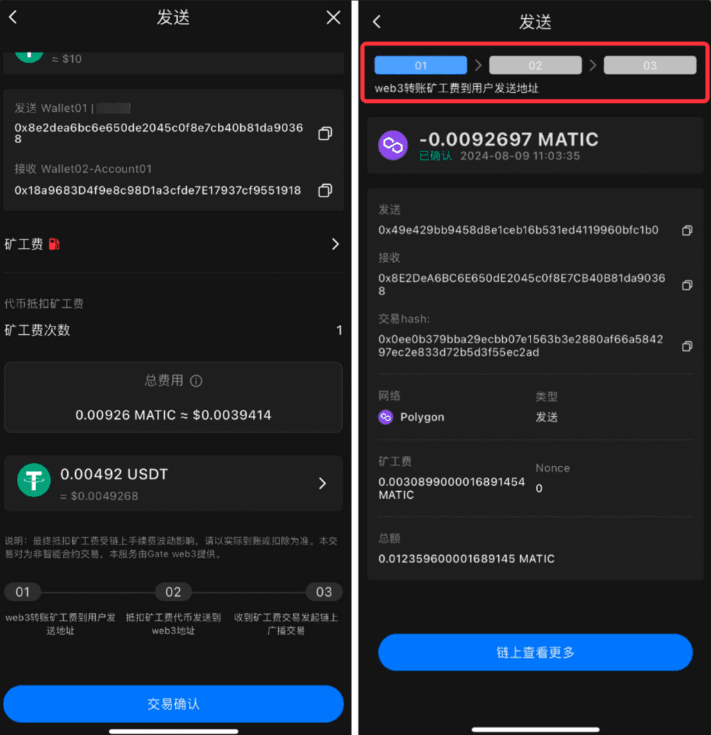 选择矿工费次数后,选择您要进行抵扣的代币,进入信息确认界面。查看发送/接收地址、矿工费、次数等信息无误后,点击【交易确认】。