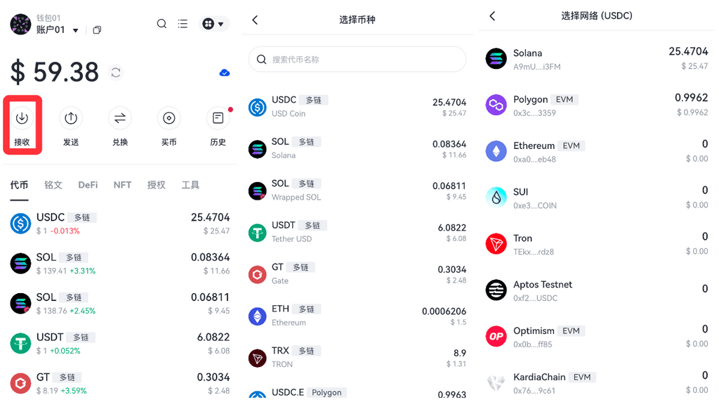 点击插件界面中的“接收”按钮,选择接收代币及接收网络,复制接收地址,粘贴至您进行转账操作的页面中即可。