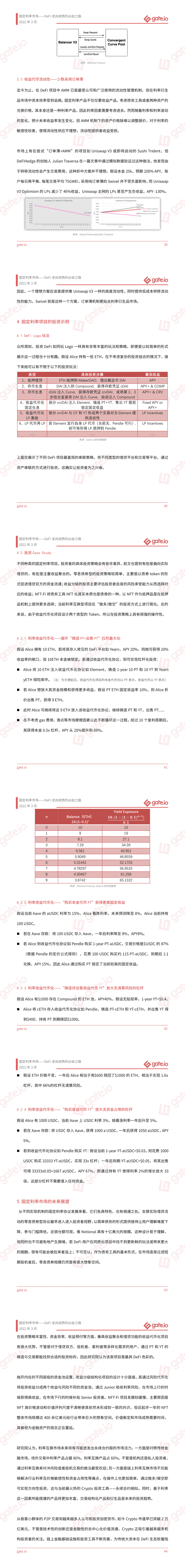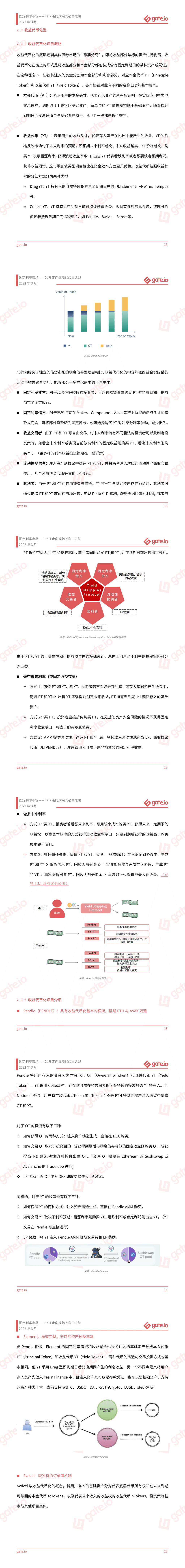 ◆零息债券型协议实现形式简单,已具备可观规模,偏向实际借贷功能,但面临清算风险和资产效率不高;收益代币化生成“息票分离”的两类资产,本金代币PT和收益代币YT的铸造和交易机制满足多样化需求的投资主体,投资策略丰富,最具DeFi特色;