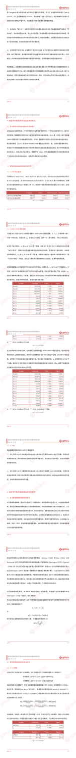 ◆以风险最小化为目标的套期保值策略研究可通过搭建OLS、B-VAR、ECM、ECM-GARCH来计算最佳套期保值比率并衡量套保绩效,结果显示永续期货最佳套保比率均超100%,交割期货均值超94%;四个模型套保绩效均达到96.50%以上,总体上OLS和B-VAR的套保绩效效果最佳,BTC永续期货组合最适合ECM-GARCH,BTC交割期货组合最适合B-VAR。