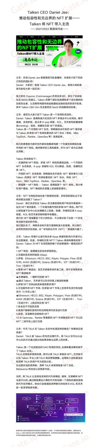 Gate.io - 2021年9月22日:Talken CEO Daniel Jee谈无边界NFT扩展,推动NFT走向主流