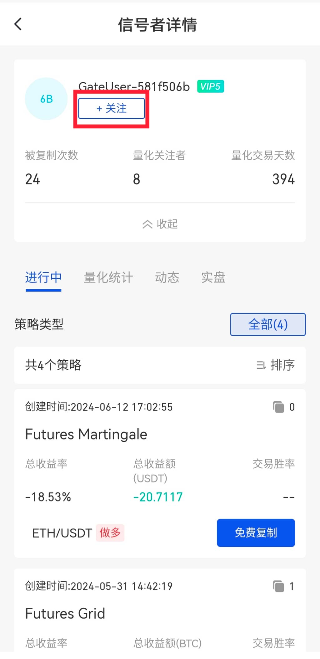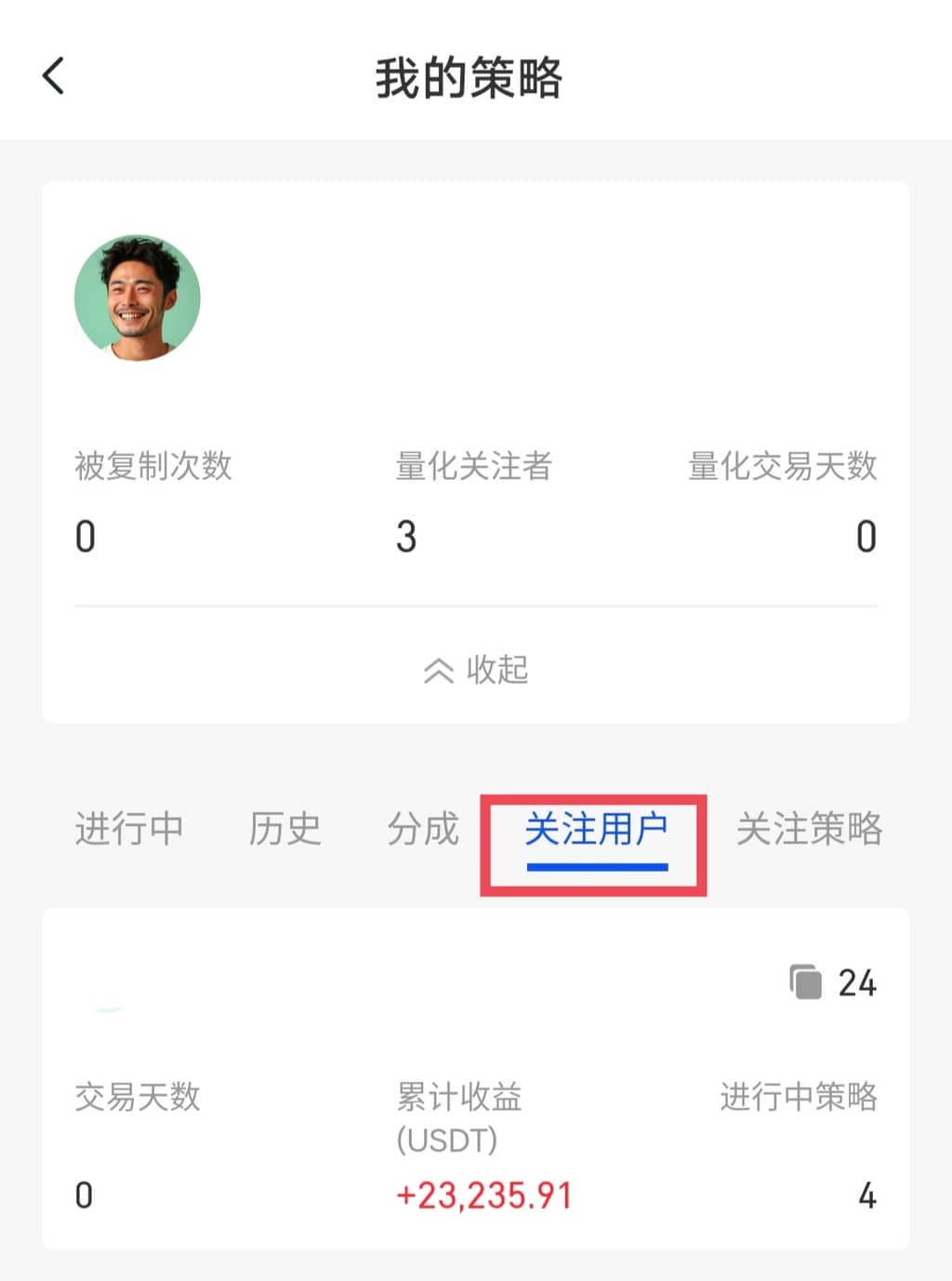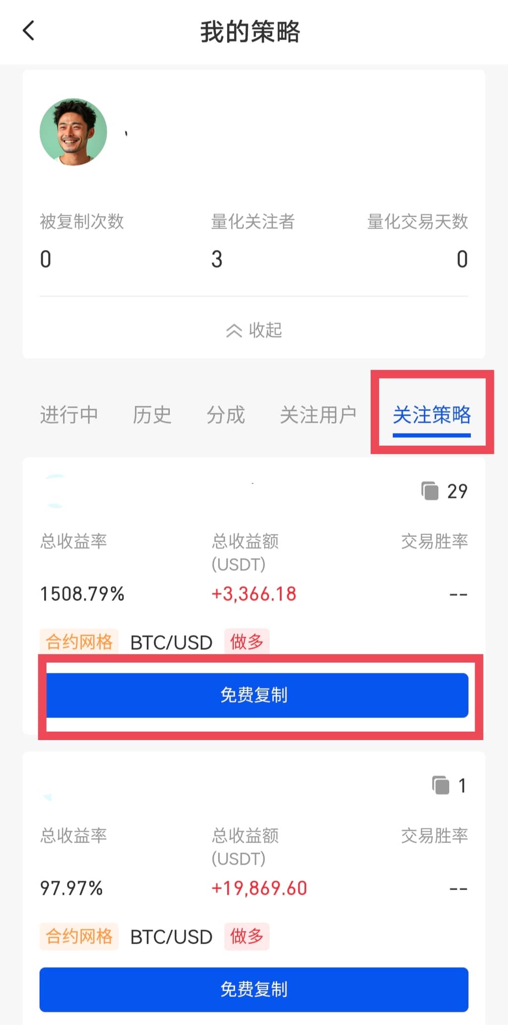 关注用户后可在“我的策略”中查看我关注的用户和策略,在“量化跟单”页面点击“我的策略”——“关注用户”,进入该用户详情界面,选择策略进行免费复制。