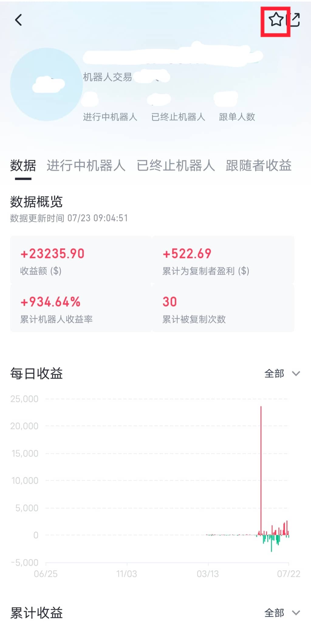 2. 在“交易机器人”的“机器人广场”,点击心仪策略信号者的名称,点击该信号者页面右上角的星号标志即可关注。