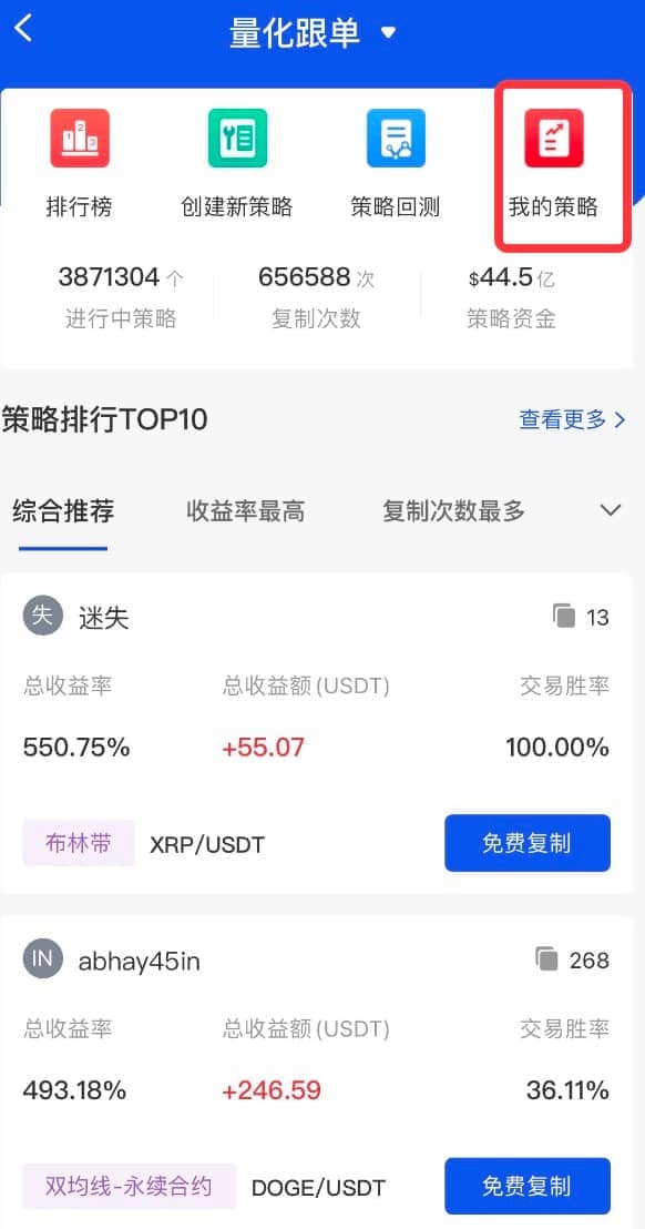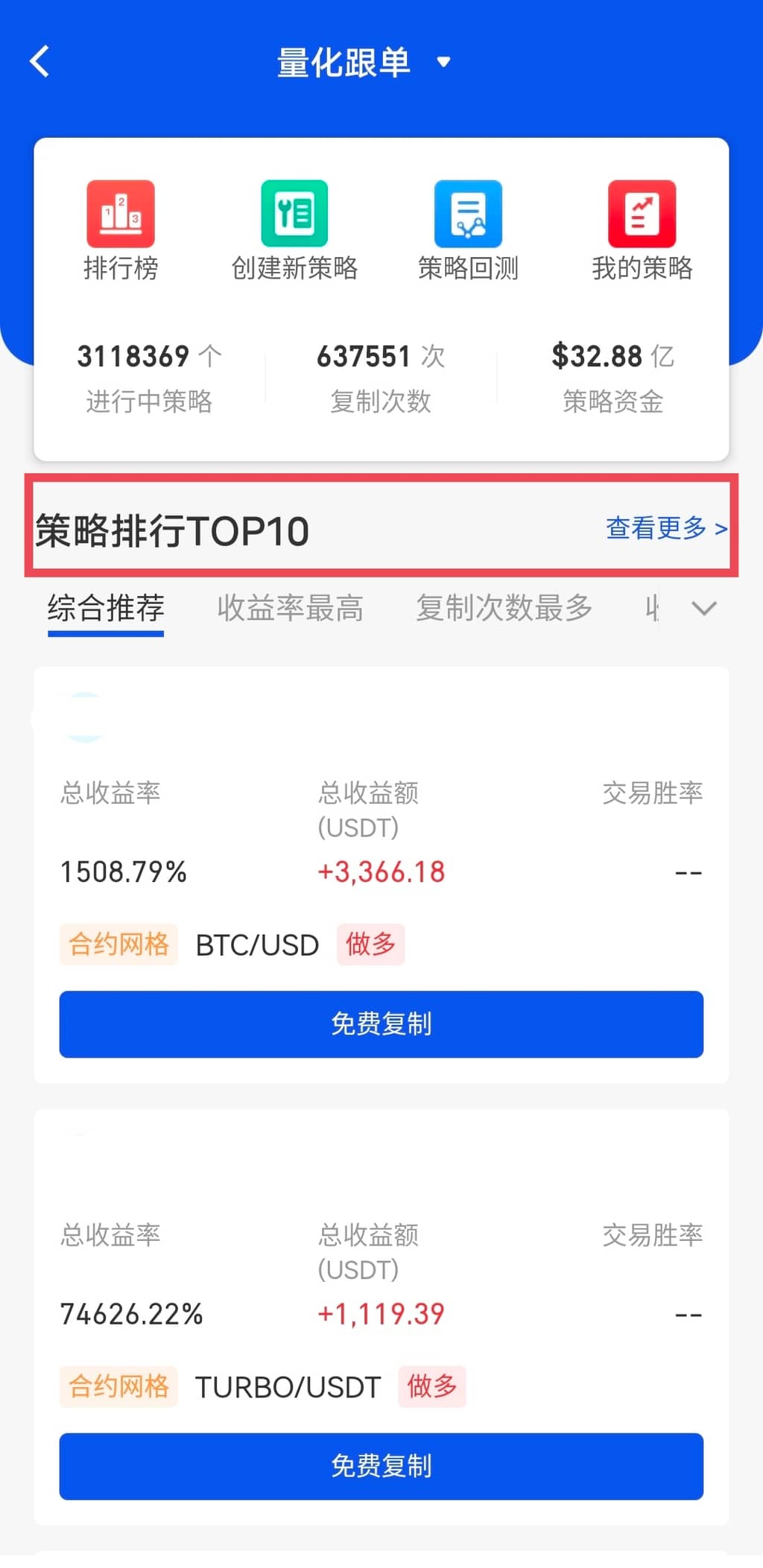 或者点击右上角中间的图标,在“量化跟单”页面,点击“查看更多”,或者在“策略排行TOP10”选择心仪的策略,点击进入到“策略明细”界面。
