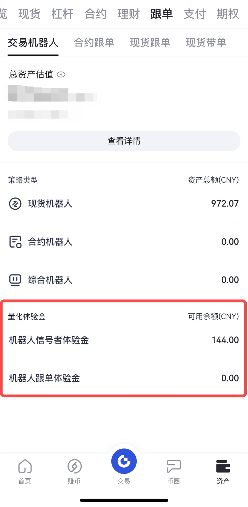 A:3)用户可在资产-跟单账户内查看自己的机器人体验金;