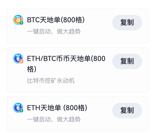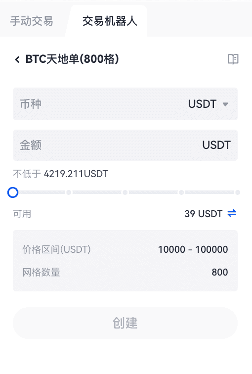 以BTC天地单为例,目前系统默认天地单网格上下限分别为100,000USD和10,000USDT, 网格数量为800,与用户只需选择币种,填写投资金额即可参与该机器人。系统会根据设定的价格区间和网格数量自动创建买入和卖出点位,实现自动化的网格交易机器人。