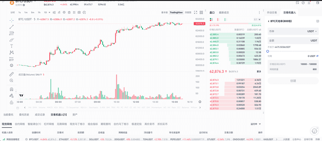 监控市场变化: 持续关注BTC市场价格走势,及时调整机器人参数以应对市场波动。