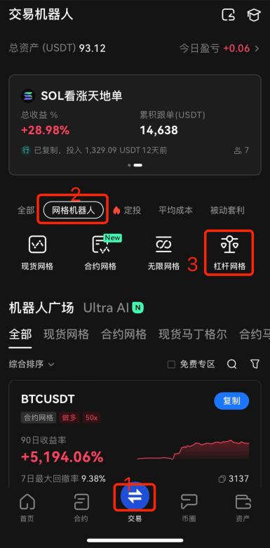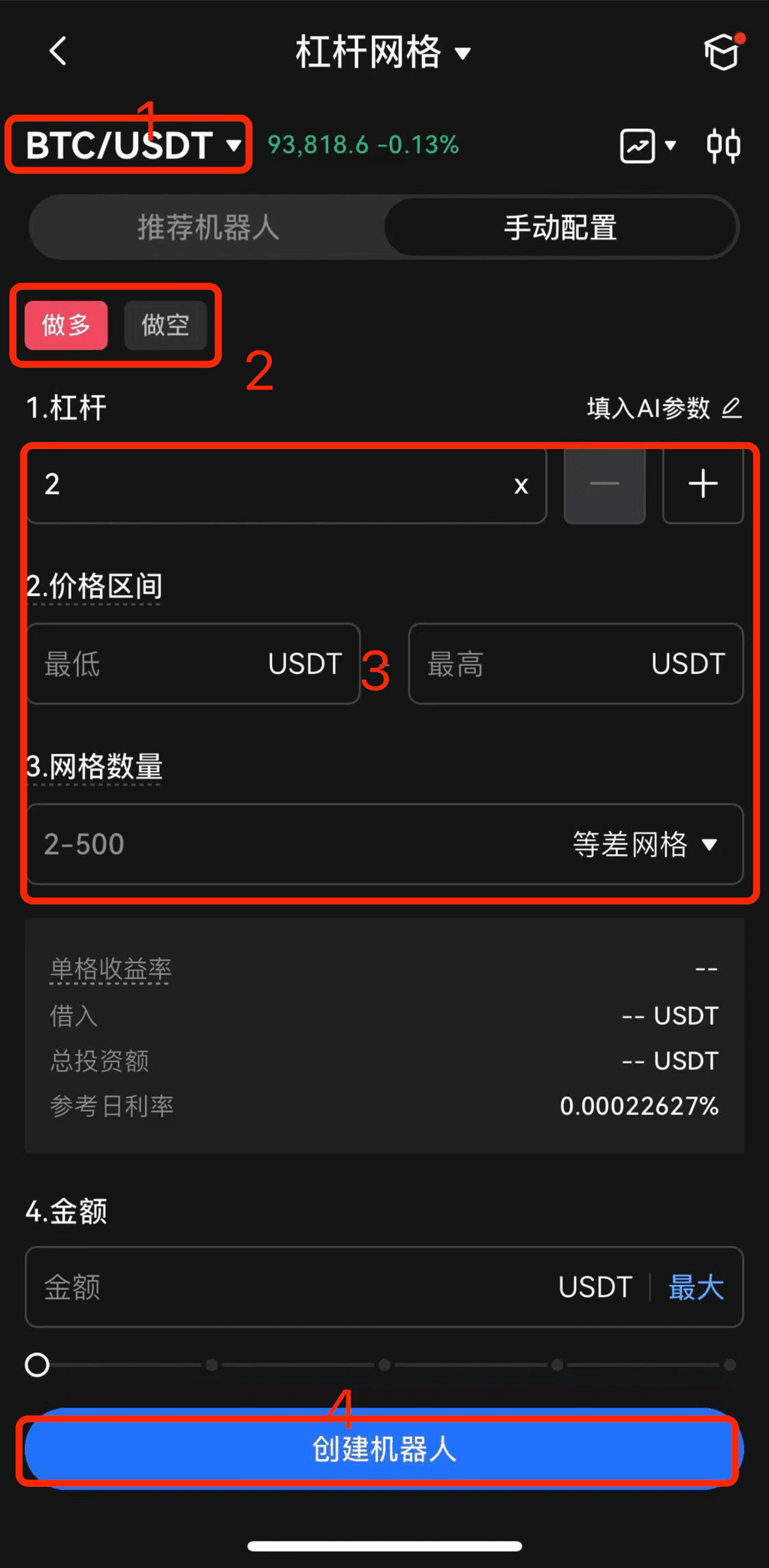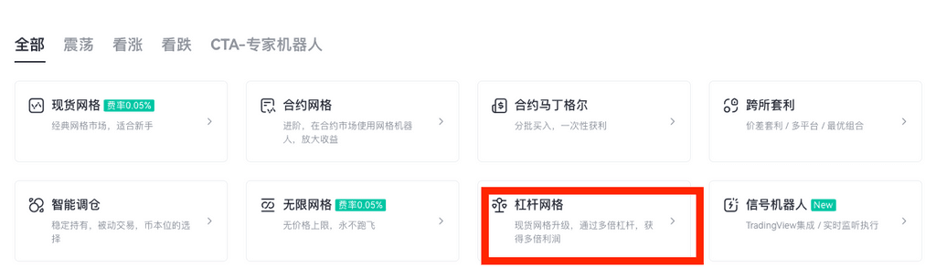 进入交易机器人首页-【网格机器人】-【杠杆网格】,选择交易对、做多/做空-按提示配置参数-点击【创建机器人】。