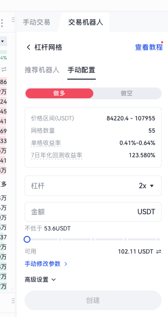 3.自定义创建:您可根据自己对震荡行情的区间判断来设置参数触发条件,确认投资金额即可创建杠杆网格机器人。