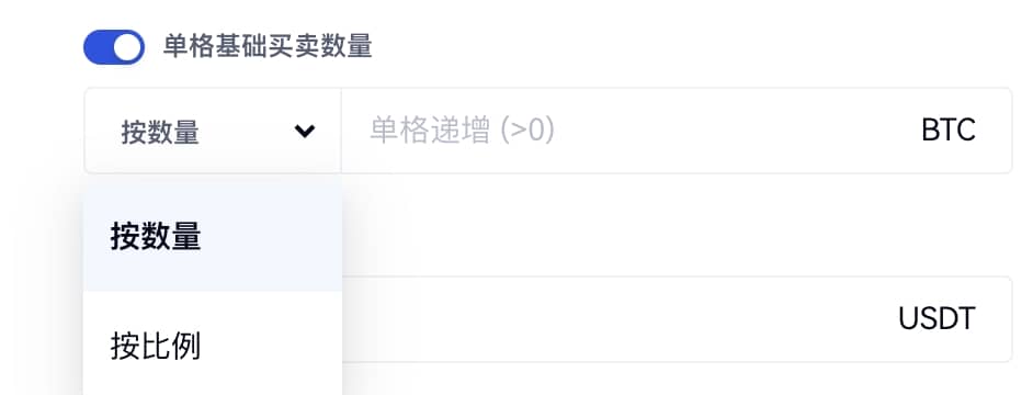 数量递增: 数量递增默认是关闭状态,在开启时,您可以选择按照数量或按照比例来增加每个网格的买卖数量,如图所示: