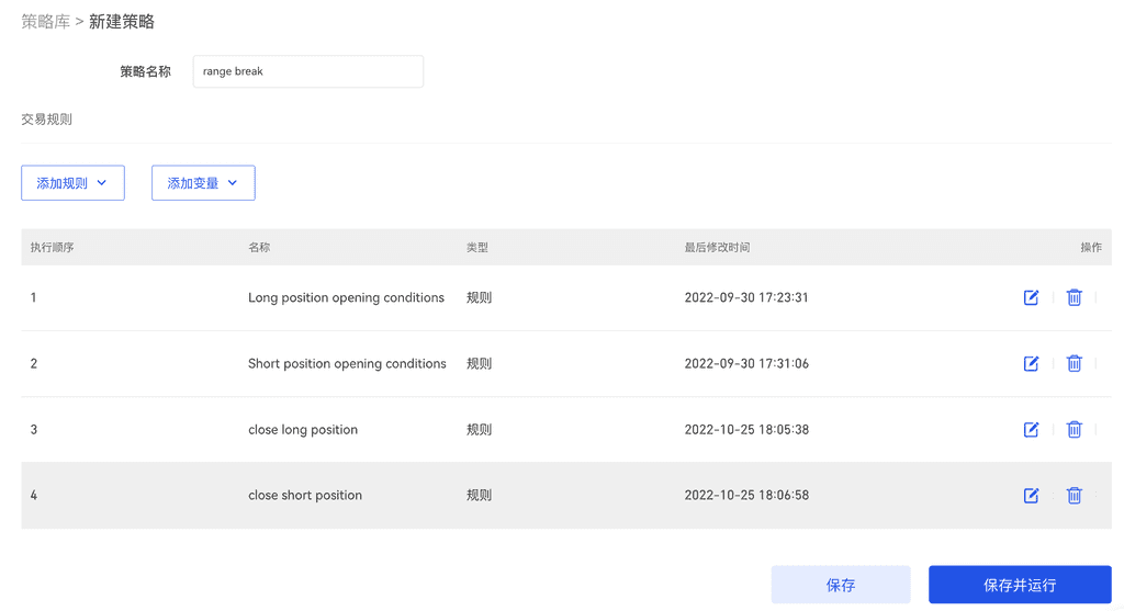 在使用自定义变量的情况下,应将自定义变量的执行顺序排在规则之前,例如“range”自定自定义变量的执行顺序为1,而开平仓规则的执行顺序为2到5。