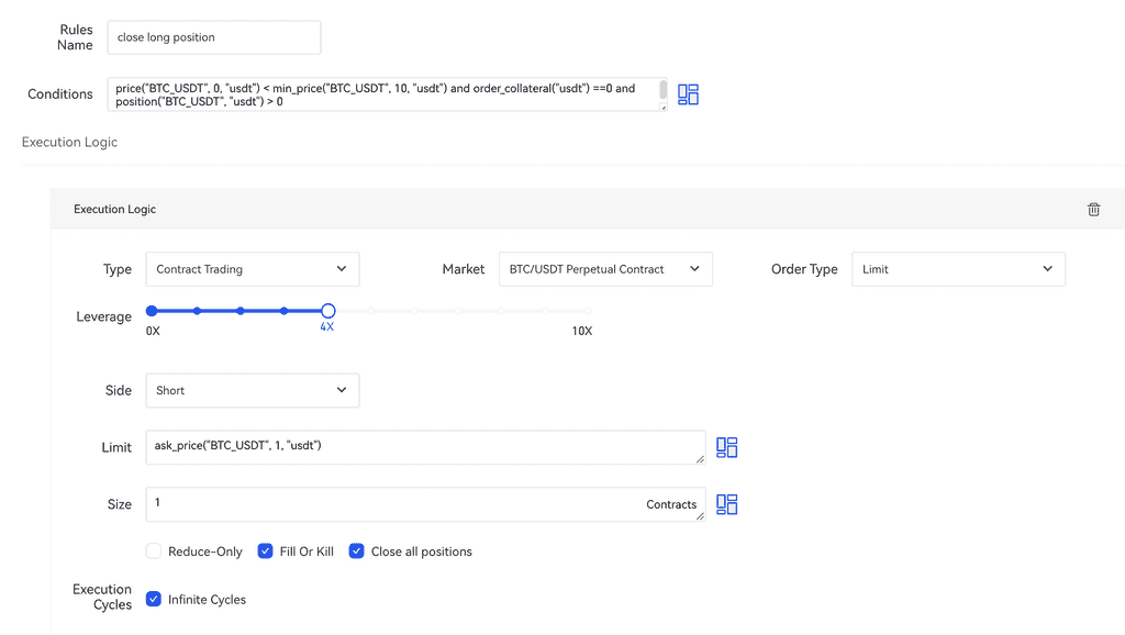 price(“BTC_USDT”, 0, “usdt”) < min_price(“BTC_USDT”, 10, “usdt”) and order_collateral(“usdt”) ==0 and position(“BTC_USDT”, “usdt”) > 0