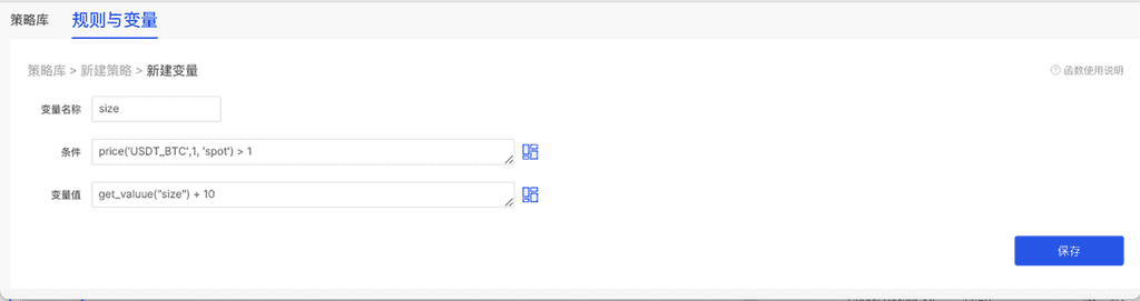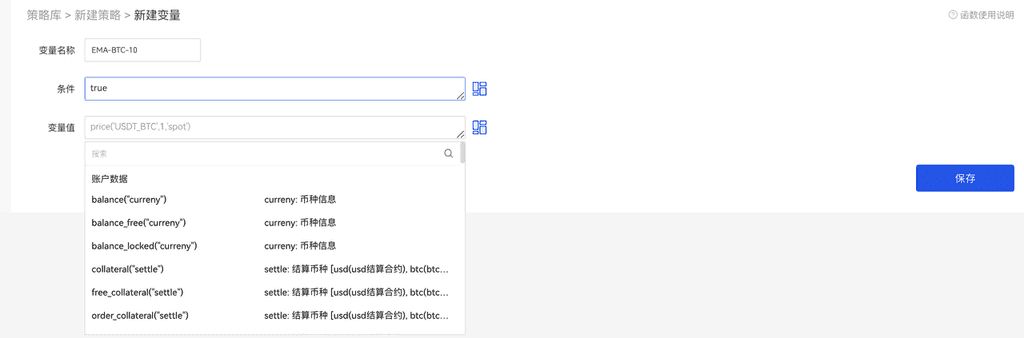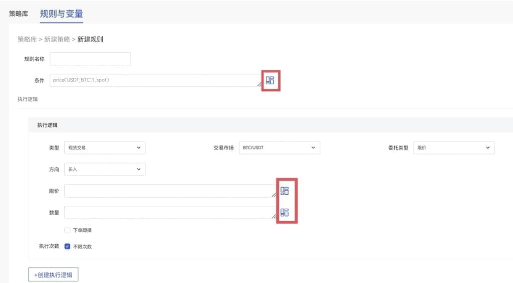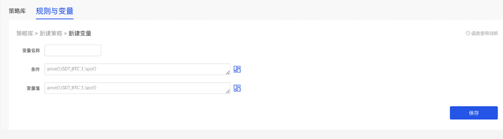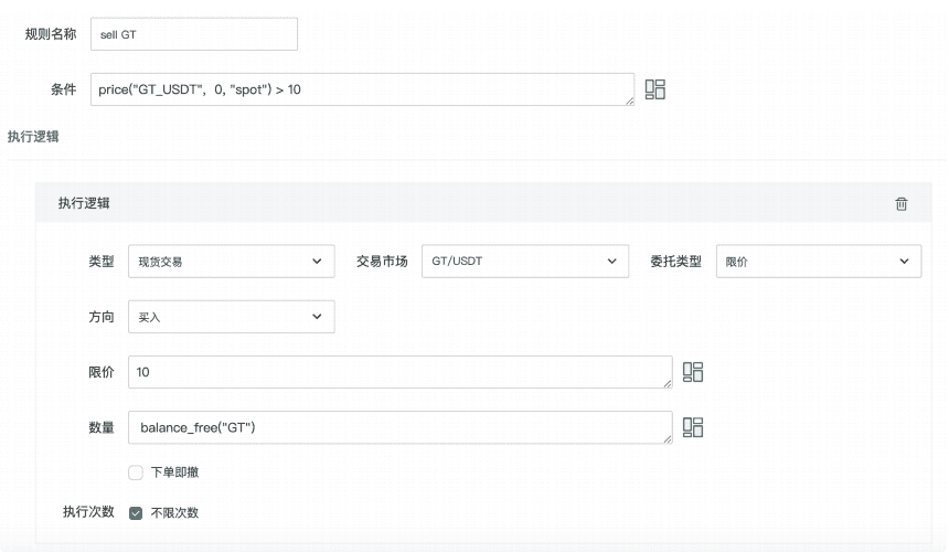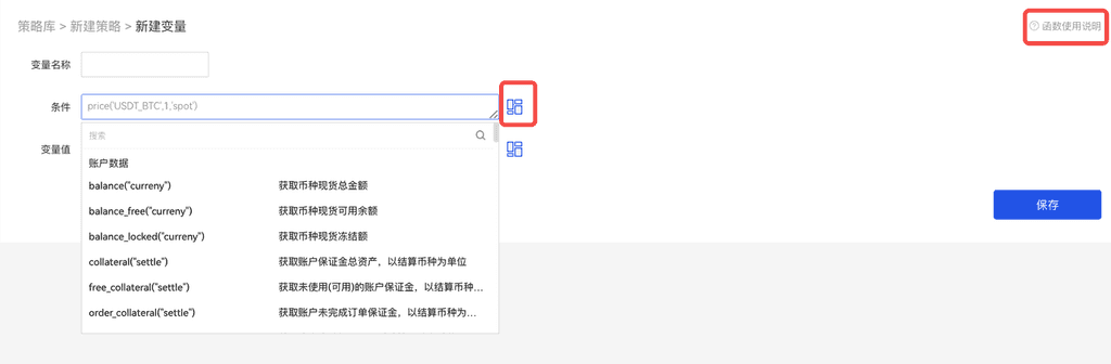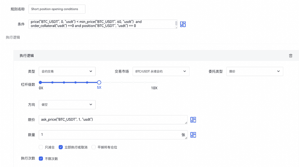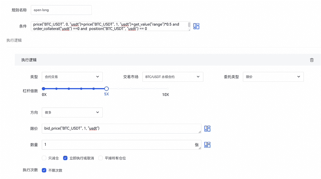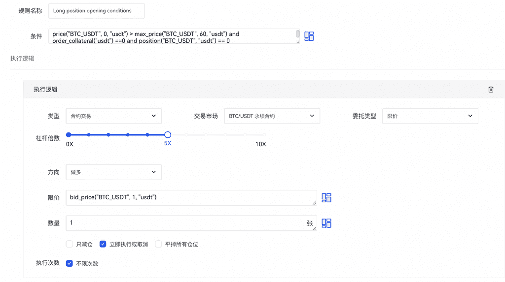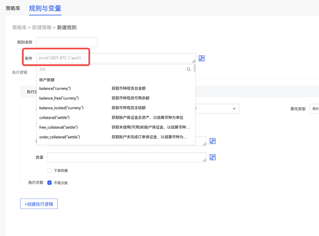条件为: price(“BTC_USDT”, 0, “spot”)>50000 可以满足更为复杂的策略,