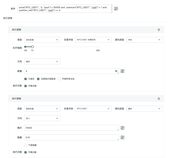 条件为: price(“BTC_USDT”, 0, “usdt”) < 50000 and premium(“BTC_USDT”, 0, “usdt”) > 1 and (position_net(“BTC_USDT”, “usdt”) == 0)