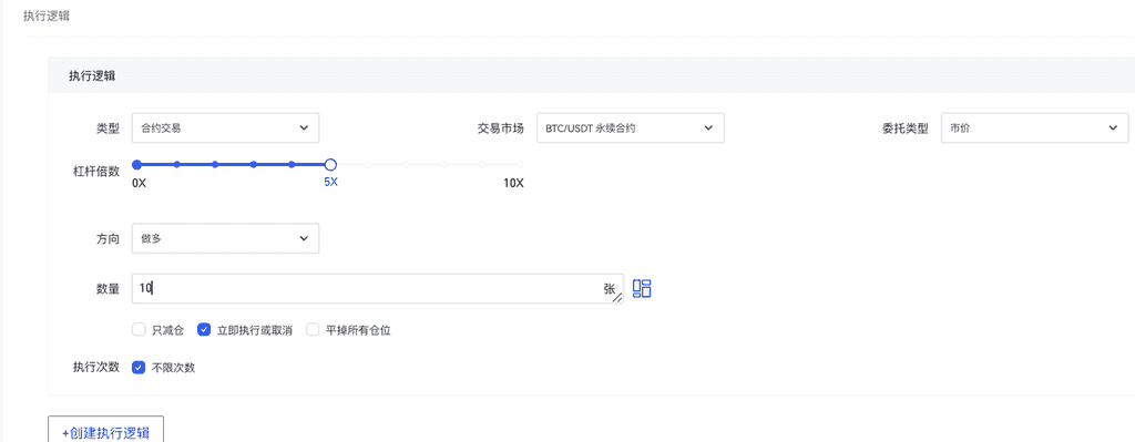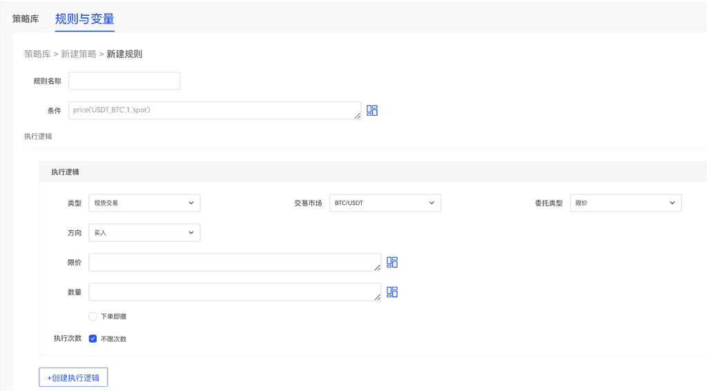 执行逻辑用于预设当条件被触发后执行什么委托,用户可以通过Gate提供的执行逻辑执行现货、合约 的委托以及创建属于⾃⼰的函数(变量)。类型用于选择交易类型,现货交易或合约交易;交易市场用于 选择策略交易的市场,⼀个规则支持多个执行逻辑选择不同的市场,最多可选择20个市场;委托类型提供多种委托,限价、市价、止盈、止损。