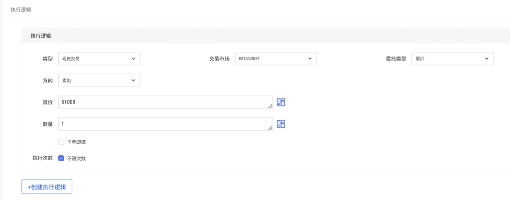 举例:在BTC现货价格超过50000 USDT后卖出BTC,执行逻辑为: