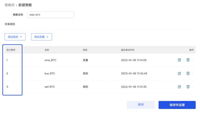 举例:如上图策略,ema-BTC在buy BTC、sell BTC中作为条件,满足条件时该策略需先买入BTC再卖出BTC,则该策略的添加顺序为ema-BTC、buy BTC、sell BTC。