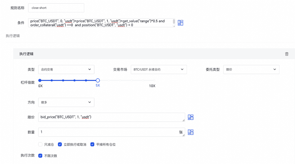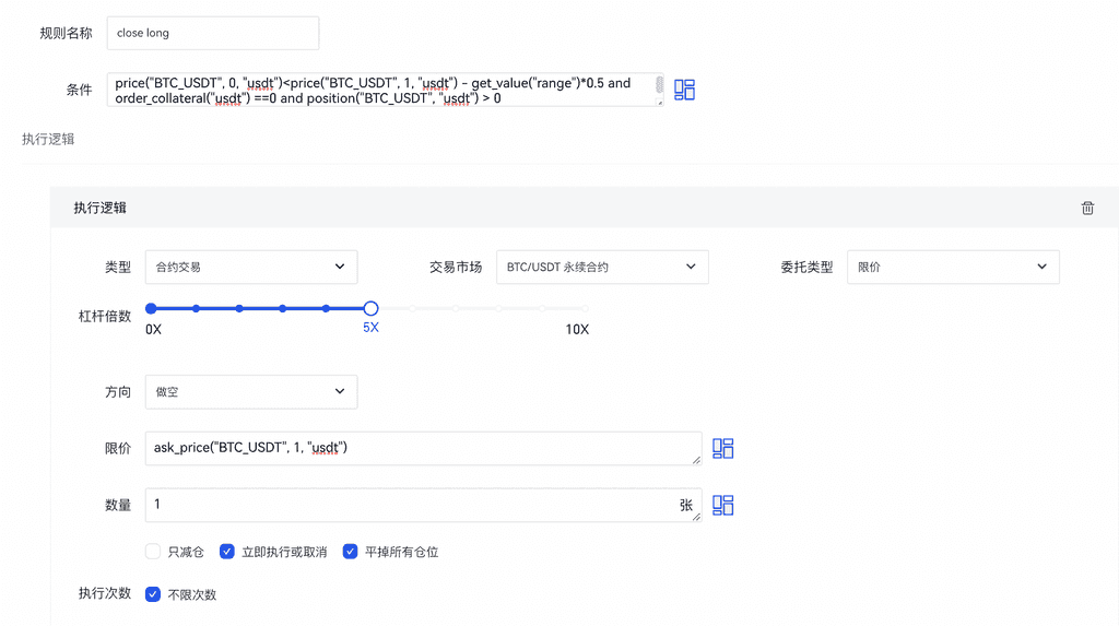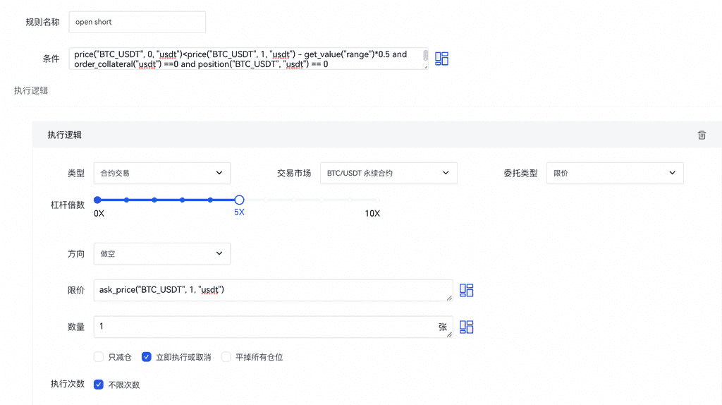 price(“BTC_USDT”, 0, “usdt”)>price(“BTC_USDT”, 1, “usdt”)+get_value(“range”)*0.5 and order_collateral(“usdt”) ==0 and position(“BTC_USDT”, “usdt”) < 0