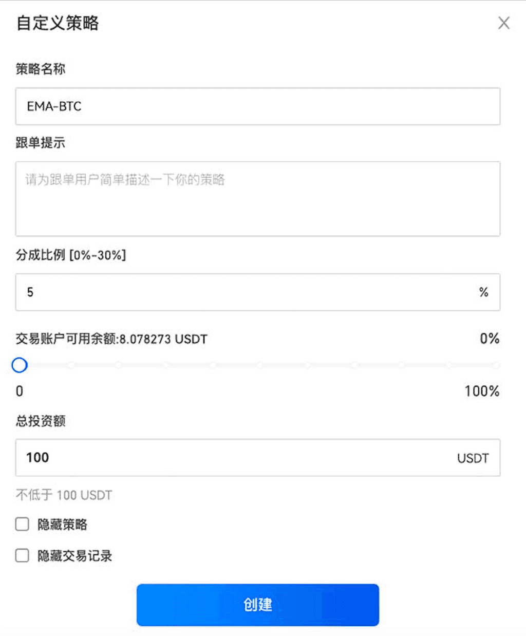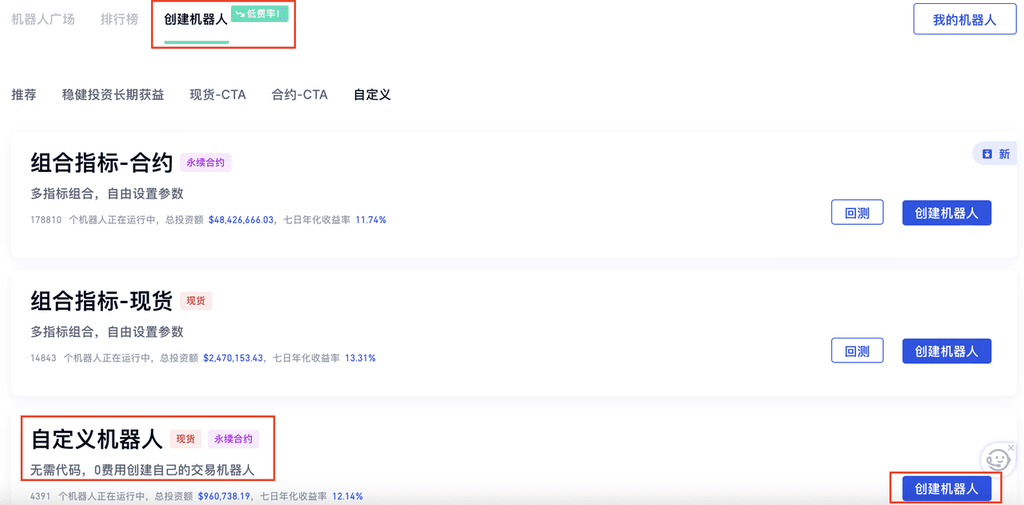交易机器人 - 创建新机器人 - 创建机器人 - 自定义机器人 - 设置参数 - 创建