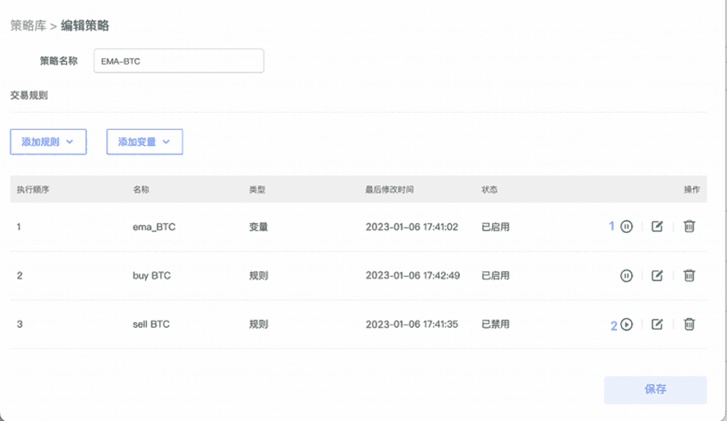 创建策略后,默认该策略中的规则与变量为启用状态,编辑策略时,可以对规则与变量禁用或启用,点击“保存”后操作立即生效,直接影响进行中的策略。