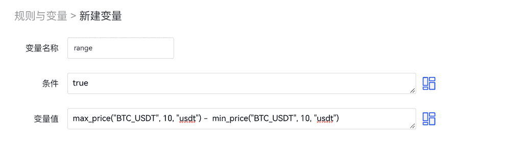 条件是用于触发计算变量值⽽预设的特定条件,用户可以通过Gate现有的市场数据、策略的资金数据,以及平台提供的数学函数来组合出满足您需求的条件。