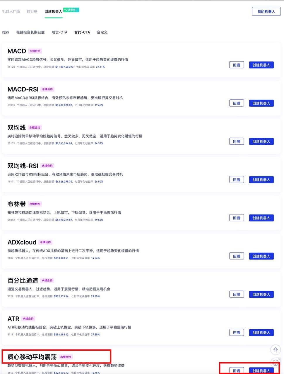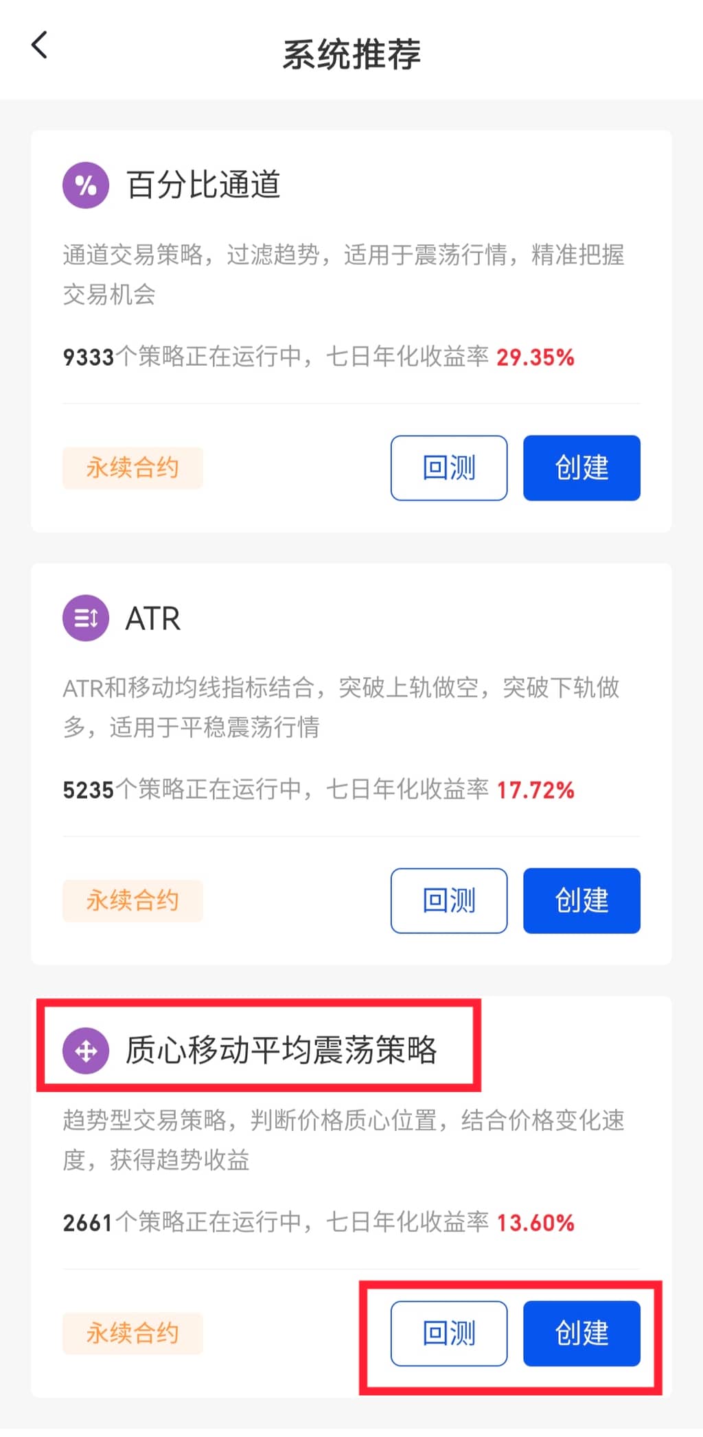 交易 - 交易机器人 - 点击右上角返回icon - 创建新策略 - 系统推荐策略 - 质心移动平均震荡- 回测 - 设置参数 - 创建