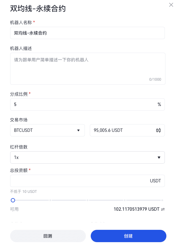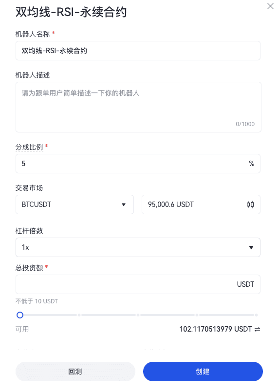 机器人 - 机器人广场 - CTA-专家机器人 - 双均线-RSI-永续合约 - 回测 - 设置参数 - 创建