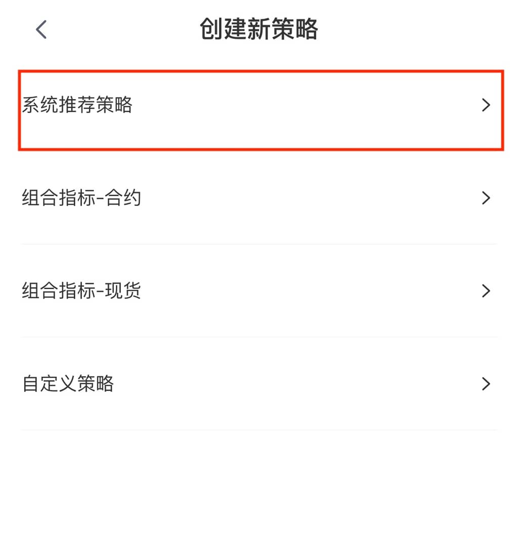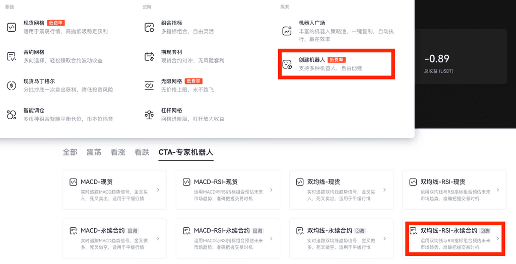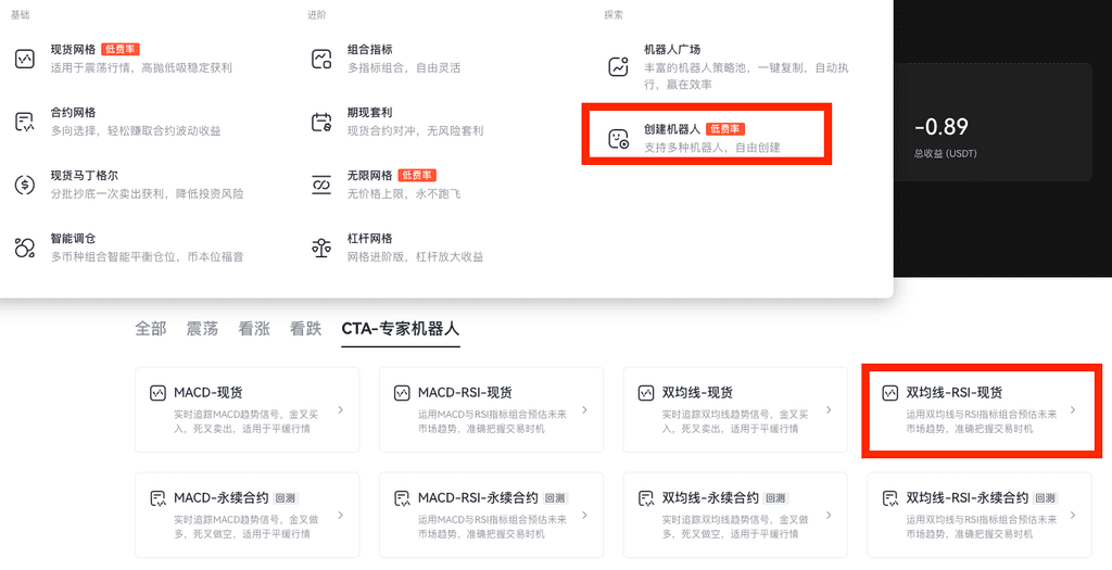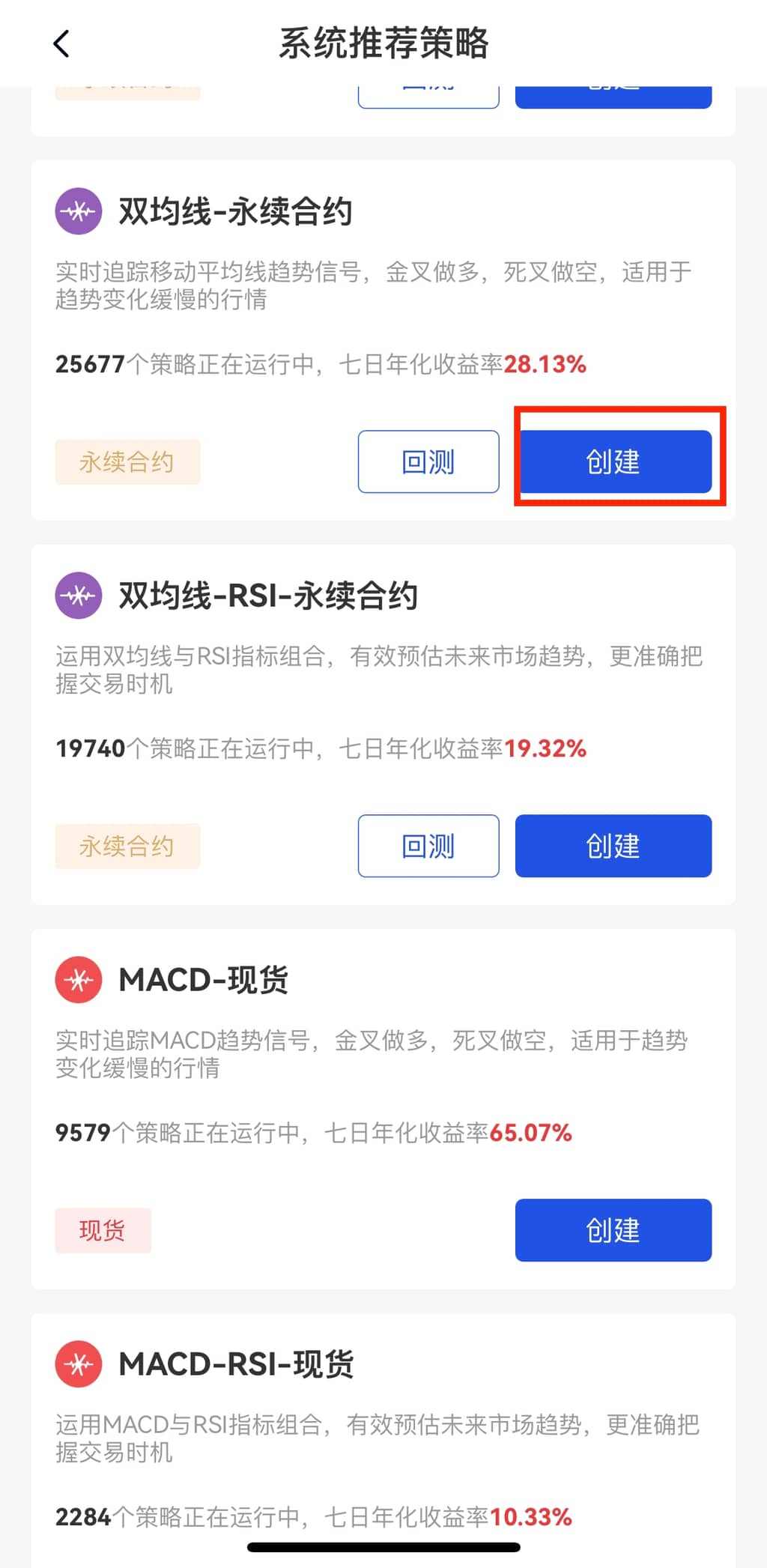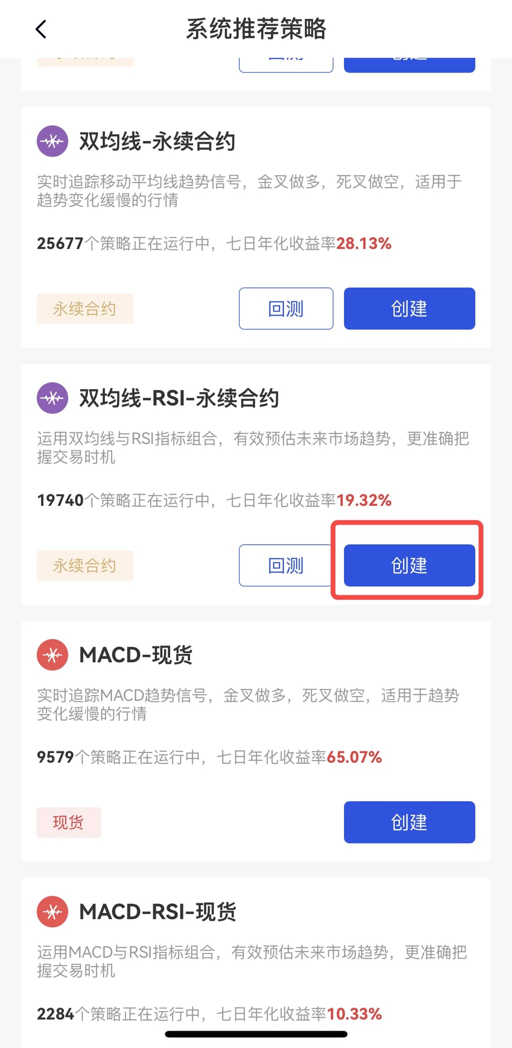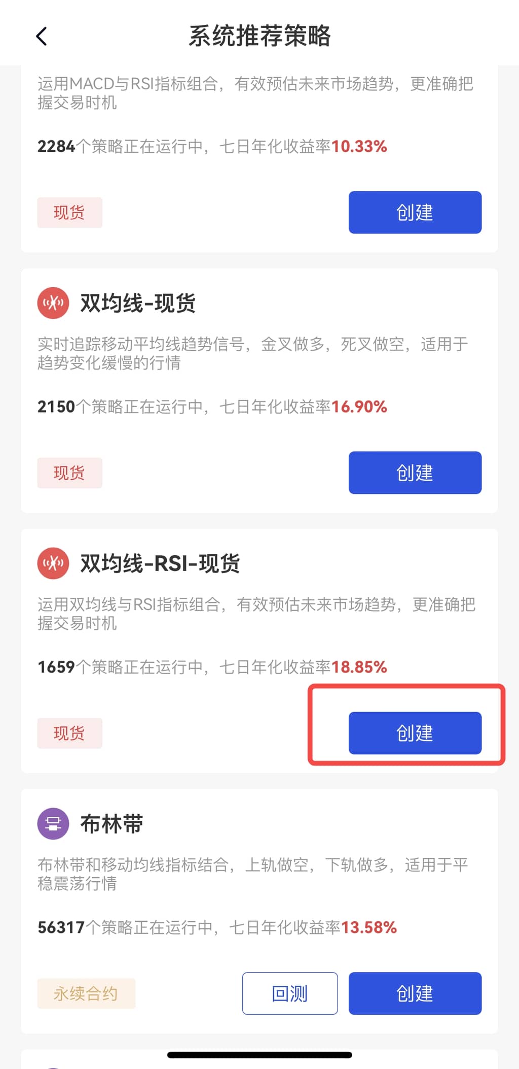交易机器人 - 右上方返回图标 - 创建新策略 - 系统推荐策略 - 双均线-RSI-现货 - 设置参数 - 创建