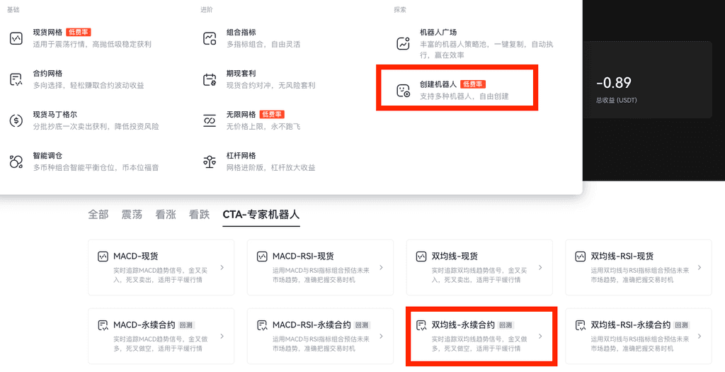 机器人 - 右上角返回图标 - 创建新策略 - 系统推荐策略 -双均线-RSI-永续合约 - 回测 -创建