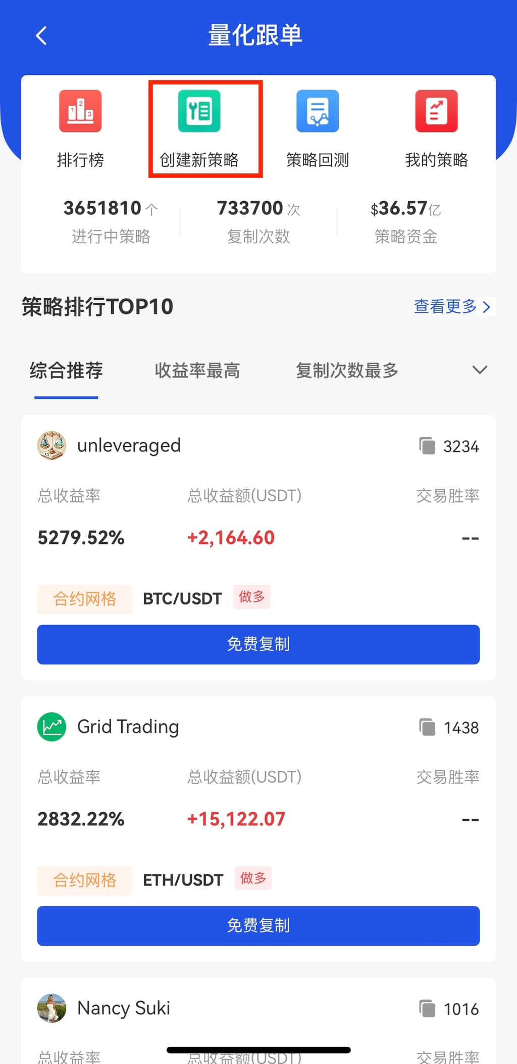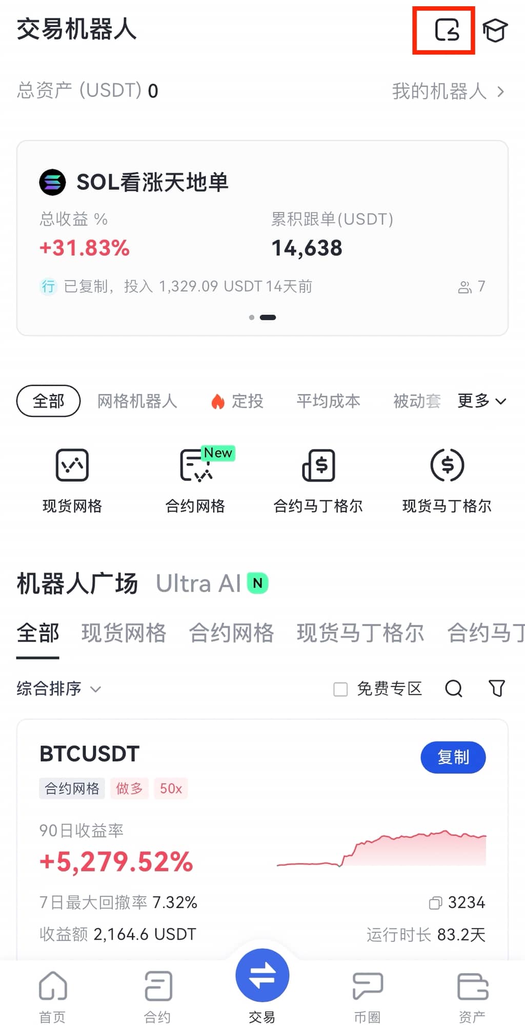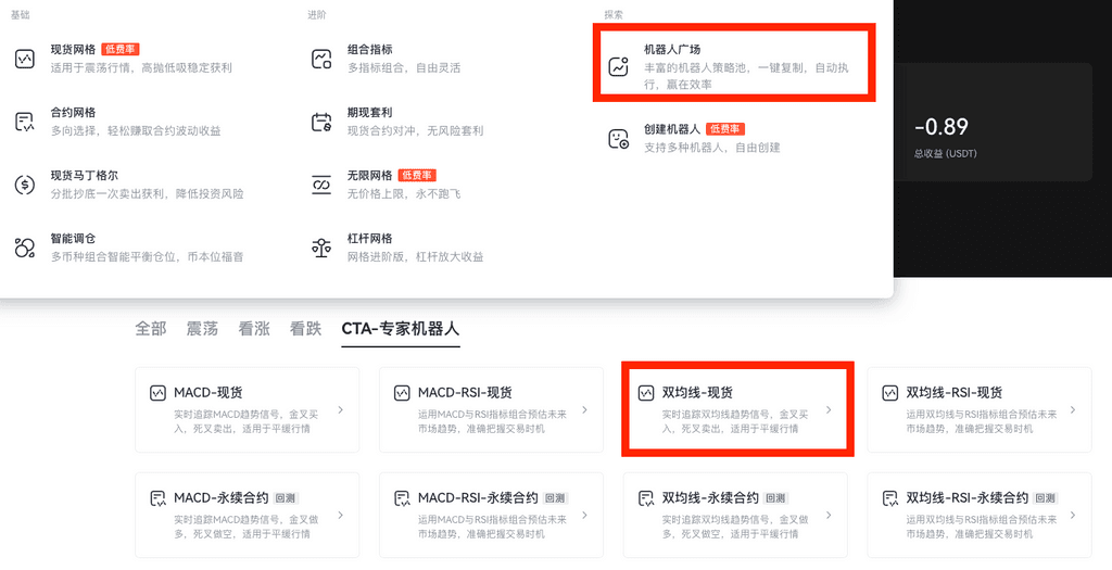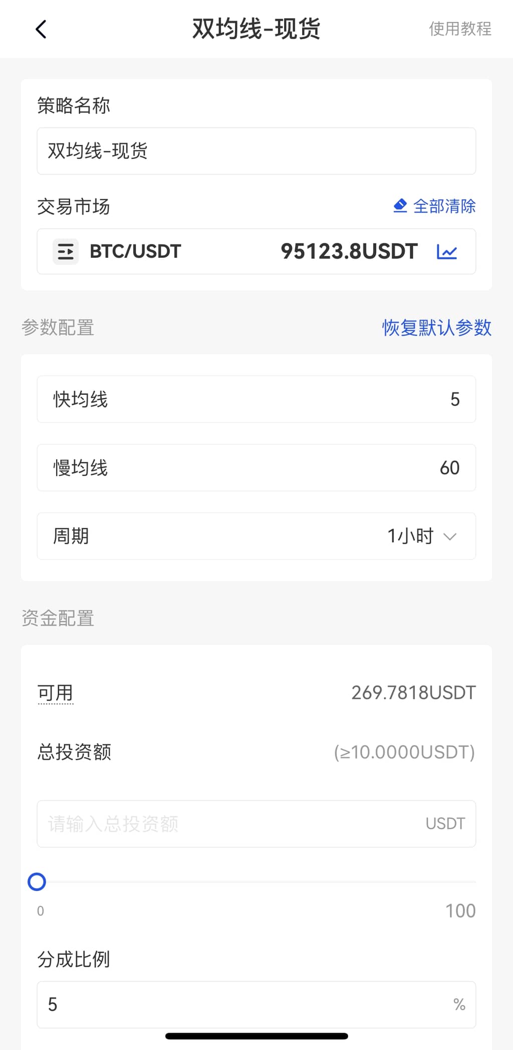 交易机器人 - 右上角的返回图标 - 创建新策略 - 系统推荐策略 - 双均线-现货 - 设置参数 - 创建