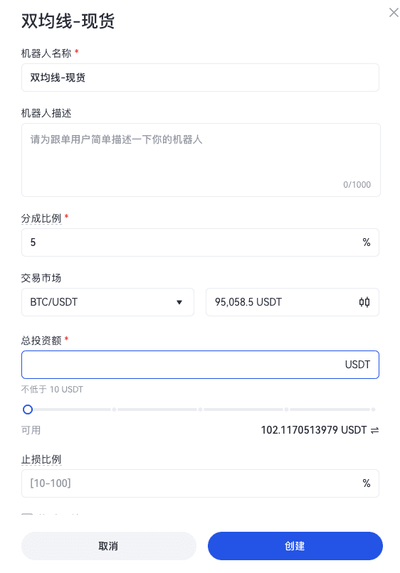 机器人- 机器人广场 - CTA-专家机器人 - 双均线-现货 - 创建 - 设置参数 - 创建