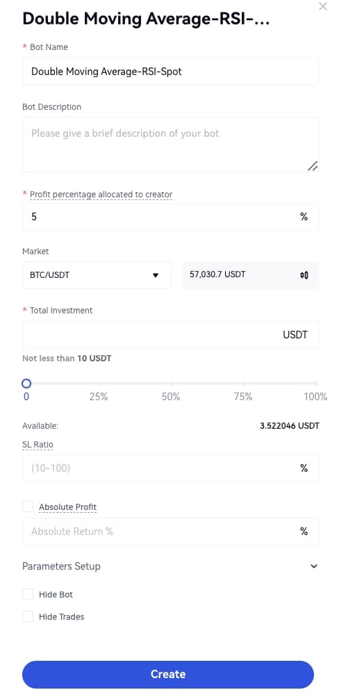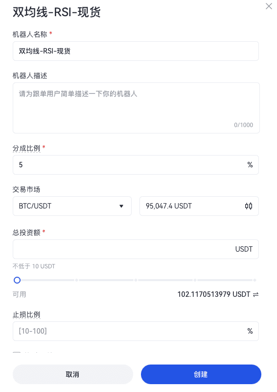 机器人 - 机器人广场 - CTA-专家机器人 - 双移动平均线-RSI-现货 - 设置参数 - 创建