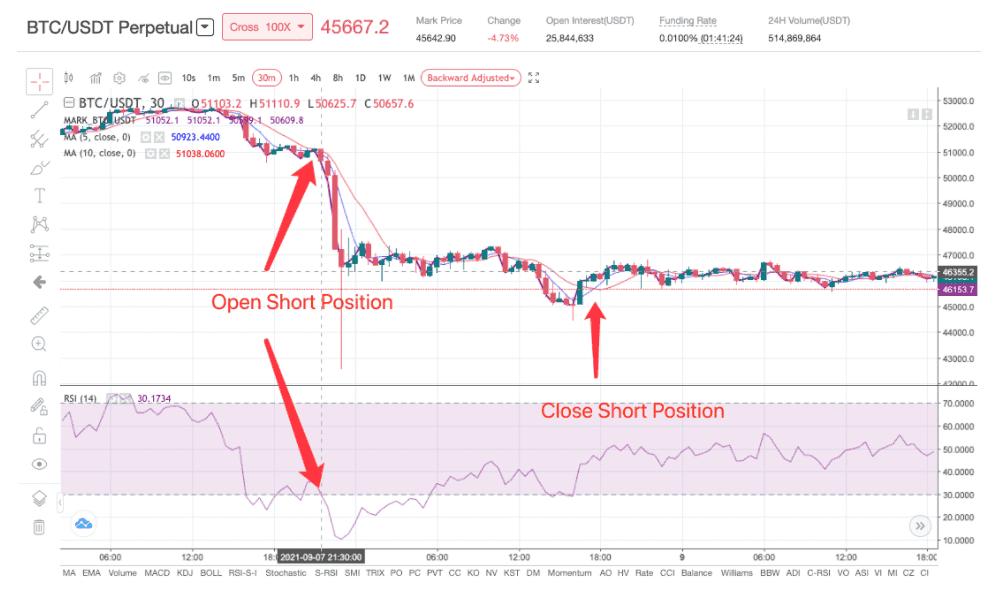 当短期移动平均线穿过长期移动平均线并且相对强弱指标(RSI)值为50-(threshold)或以下时,机器人会做空。当短期移动平均线突破长期移动平均线并且相对强弱指标(RSI)值为+50(threshold)或以上时,机器人会平掉空头头寸;例如,在下图中,阈值设为15,入场和出场点由箭头标示: