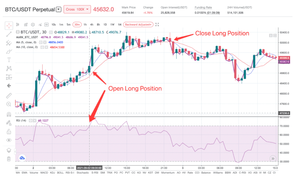 当短期移动平均线突破长期移动平均线且相对强弱指标(RSI)值大于或等于50(阈值)时,机器人将做多;当短期移动平均线穿越长期移动平均线且RSI值小于或等于50减去阈值时,机器人将平掉多头仓位。