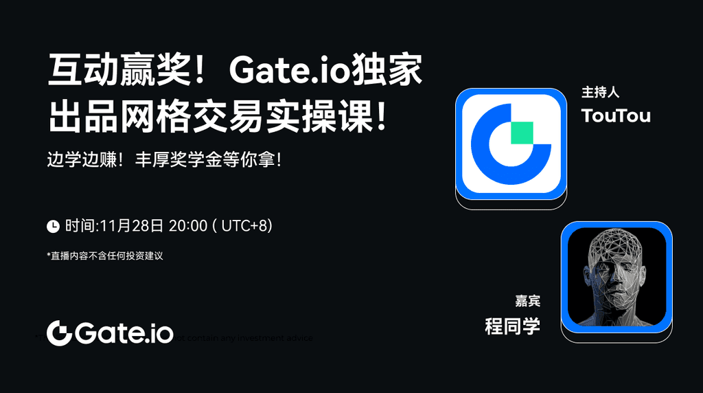 Gate交易机器人诚邀您参加11月28日20:00(北京时间)举行的网格交易直播课,牛市即将来临,网格交易策略将帮助您在市场波动中稳健获利,实现盈利无忧,直播间将提供专属网格交易活动,门槛更低,福利更丰厚,课堂中还有互动答题环节,您将有机会赢取机器人体验金、VIP+1、点卡等丰富奖励,观看直播的用户还可参与红包雨活动,新用户在直播当天注册并观看满10分钟,即可获得VIP+1(7天)奖励,邀请人和新用户共同观看也可获得同等奖励,直播期间还有神秘福利活动,敬请期待,注意事项包括新用户需完成KYC2认证,活动最终解释权归Gate所有,若有疑问请加入官方社群咨询,快来预约直播,不要错过这次机会!