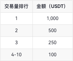 4.奖励2中,要求用户交易量排名TOP10的用户,交易量之和不得低于12,000,000 USDT,如未能达到,则按照实际的top10的交易量进行等比例的奖金折减;