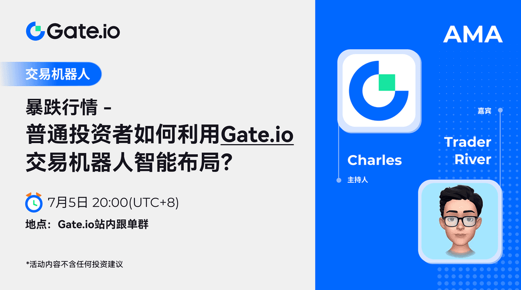 Gate交易机器人将于7月5日20:00(UTC+8)在Gate站内跟单群举办一场关于暴跌行情的文字AMA,旨在帮助普通投资者利用智能布局优化投资策略,特邀资深交易专家Trader River分享当前行情分析及交易机器人策略,参与者可在直播过程中领取红包雨并与嘉宾互动提问,有机会赢得$10的Gate点卡奖励,活动需完成KYC2认证,所有讨论仅代表个人观点,活动最终解释权归Gate所有,更多信息请访问交易机器人官方网站或加入官方社群进行咨询,欢迎大家踊跃参加,抓住市场机会,提升投资收益。