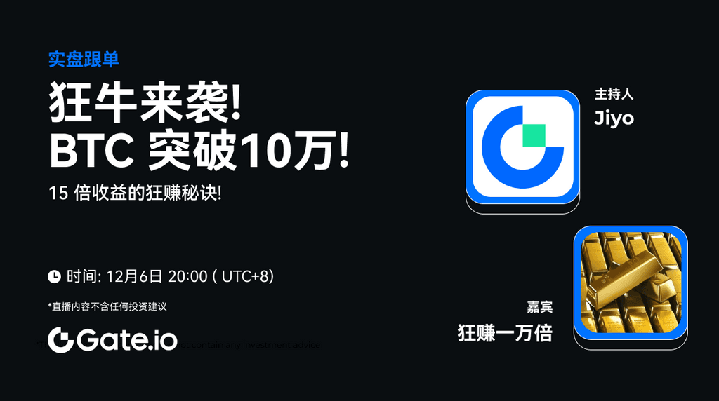 在12月6日20:00(UTC+8),Gate将举办一场明星带单员AMA直播活动,特邀资深带单员“狂赚一万倍”分享他的成功经验与15倍收益秘诀,结合市场热点,深入探讨做单依据,观看直播的用户不仅可以参与红包雨活动,还能与嘉宾进行现场互动提问,有机会获得$10的Gate点卡奖励,新用户在直播当天注册并观看满10分钟即可获得VIP+1(7天)奖励,邀请新用户一起观看同样可以获得该奖励,此外,直播中还将有神秘福利活动,敬请期待,注意事项包括新用户需完成KYC2认证,活动最终解释权归Gate所有,若对活动或交易机器人产品有疑问,可加入官方社群或联系客服,Gate提供安全、便捷的交易平台,支持超过1400种加密货币交易,欢迎新用户注册,老用户推荐他人注册可获40%佣金。