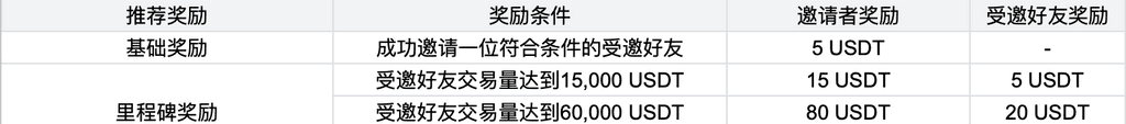 4.邀请者获得基础奖励要求受邀好友至少达到交易量5,000 USDT。推荐活动中的交易量可为受邀好友跟单或带单交易量。