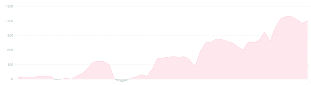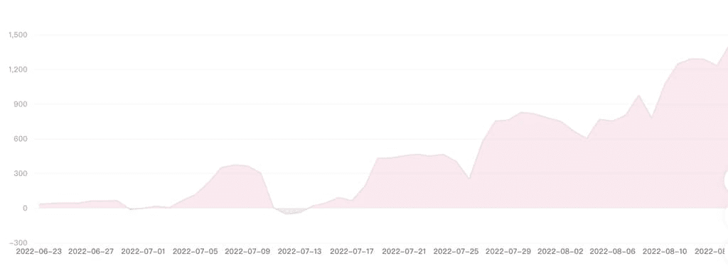 图中收益率峰值代表该交易员的潜在带单能力,收益率峰值与低估值则反映交易员的带单稳定性。整体而言相对该交易员带单情况稳定可靠且处于收益率整体激增阶段,同时也会出现间歇性,小幅度收益率下降, 但是止损控制比较好,很少有亏损本金情况发生,说明该交易员有足够的手段应对多变的市场行情,可以考虑跟随其做单。
