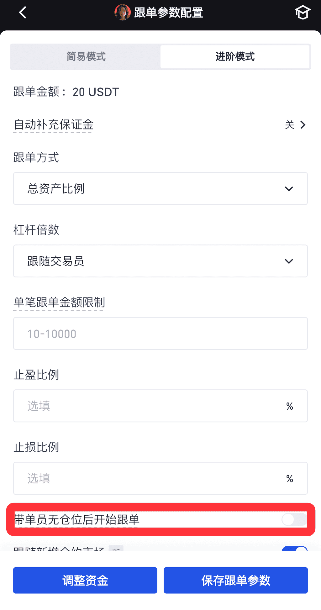 2.1检查跟单模式:跟单员在进阶跟单模式下,首先我们需检查下是否开启“带单者无仓位后才开始跟单”,关闭后如交易员有做单可立即跟单;