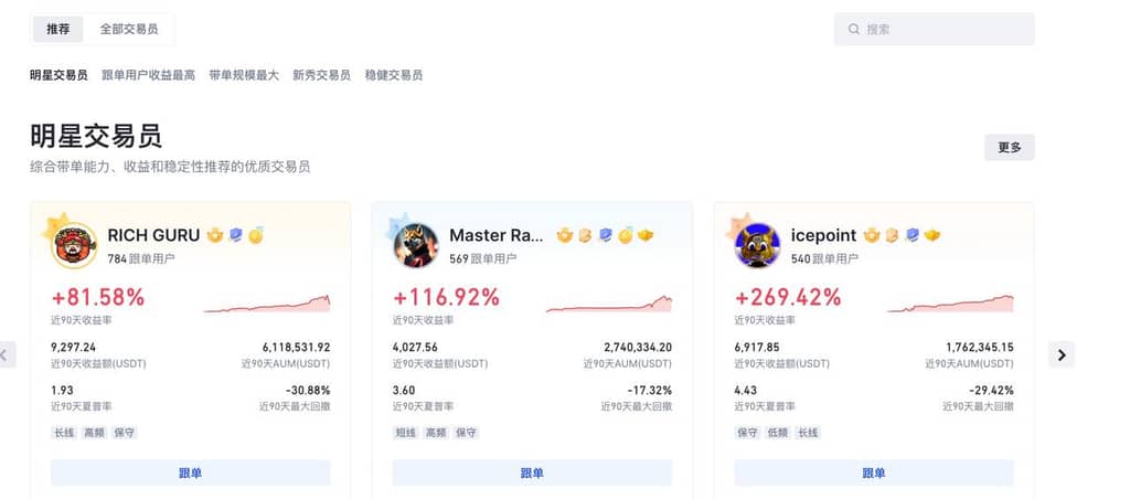 Gate实盘交易首页推荐位交易员是由系统通过客观算法得出,具有一定参考价值,跟单员可择优进行跟单。