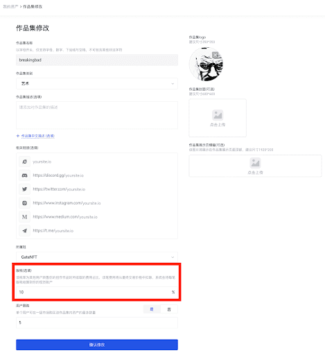 而作品集版税税率可以在作品集信息编辑页随时进行修改,在该作品集内创建作品时,会默认填充作品集版税作为作品版税税率,当然也可以针对该作品进行自定义修改。