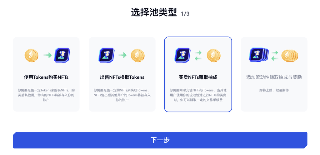 首先在创建流动性池时选择池类型,目前共支持三种池类型(单边买入 NFT、单边卖出 NFT、双边买卖 NFT 赚取抽成),此时我们点选最右边的选项,创建一个双边流动性池。